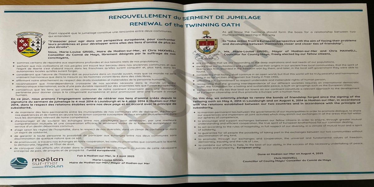 2025, renouvellement de la charte pour les 10 ans de jumelage à Moëlan sur mer.